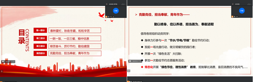 节俭教育与劳动实践。我院坚持节俭教育和劳动实践相结合,辅导员借助习近平总书记的勤俭奋斗事迹、以“毕生的梦想,就是让所有的人远离饥饿”的杂交水稻专家袁隆平的故事、李子柒制作的《水稻的一生》等内容开展节俭教育,帮助新生切实体会生活的来之不易;动员同学身体力行,参加“四个一”活动,投身劳动实践,立志做有理想、敢担当、能吃苦、肯奋斗的时代好青年。
