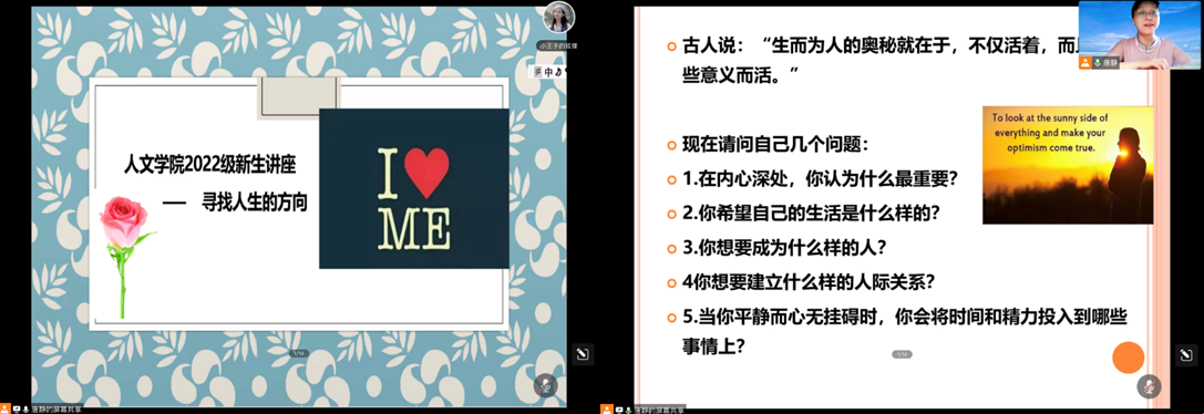 心理健康教育。为保证学生身心健康,我院组织开展专题讲座、心理健康测试等活动,积极开展新冠肺炎疫情防控教育、心理健康教育。建立新生个人心理健康档案,及时了解和掌握新生的心理动态;邀请心理研究与咨询中心唐静老师开展“寻找人生方向”新生心理适应线上讲座,帮助新生保持积极健康稳定的学习心态。