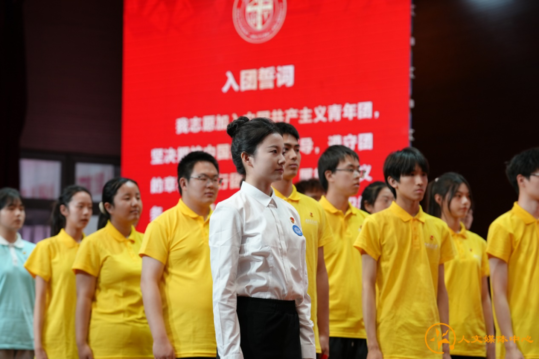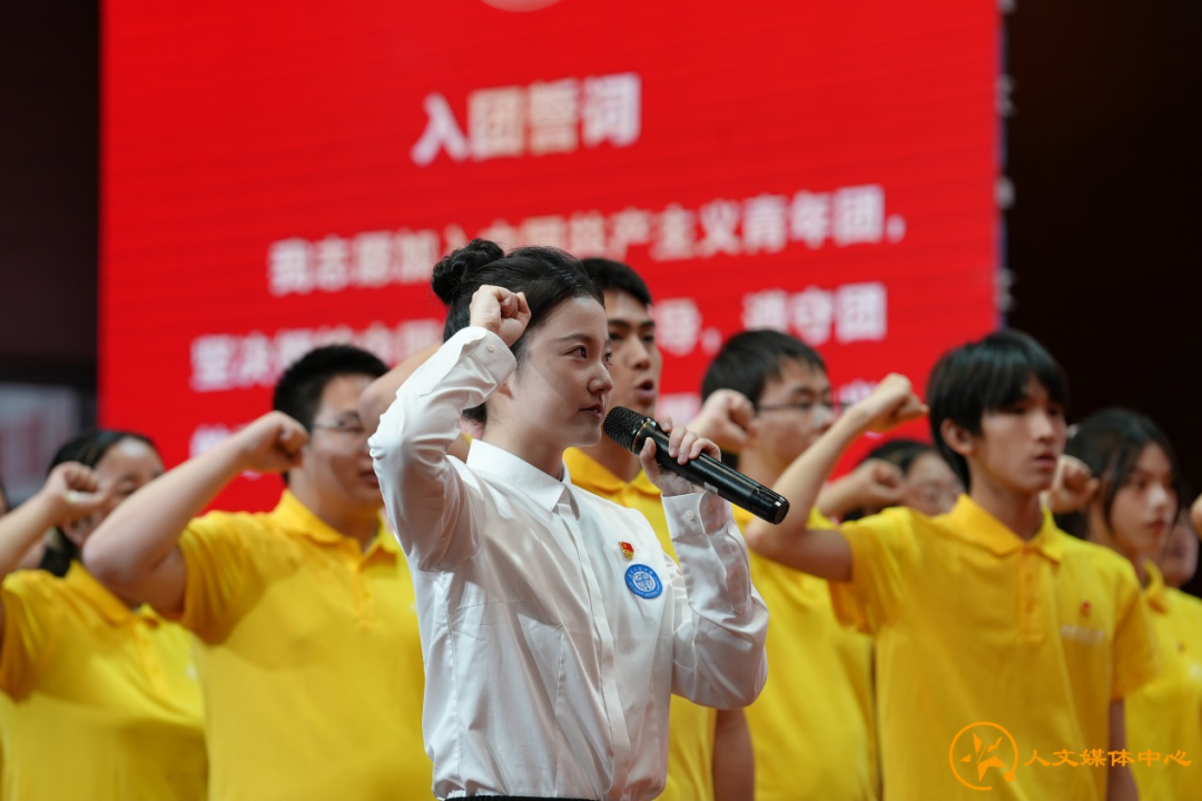 校十佳团支部书记吴佳媛到场参加了本次表彰大会并带领现场全体团员宣誓,在庄严肃穆的氛围下,新一批共青团成员完成了入团仪式,老团员重温了入团誓词。