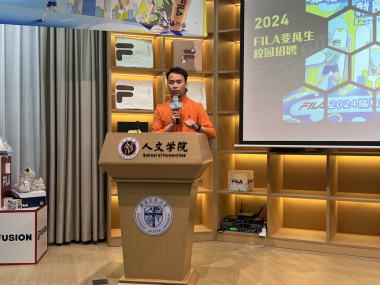 随后,FILA集团人力资源部副总监张政学向参会同学们介绍了FILA的品牌背景与品牌发展的前世今生。FILA中国加入安踏集团后,始终坚持品牌创新、产品创新和渠道创新这三大核心,最终成为行业领导者。同学们认真聆听张总的介绍,积极参与互动环节,对FILA品牌和集团的发展有了初步的了解与认识。
