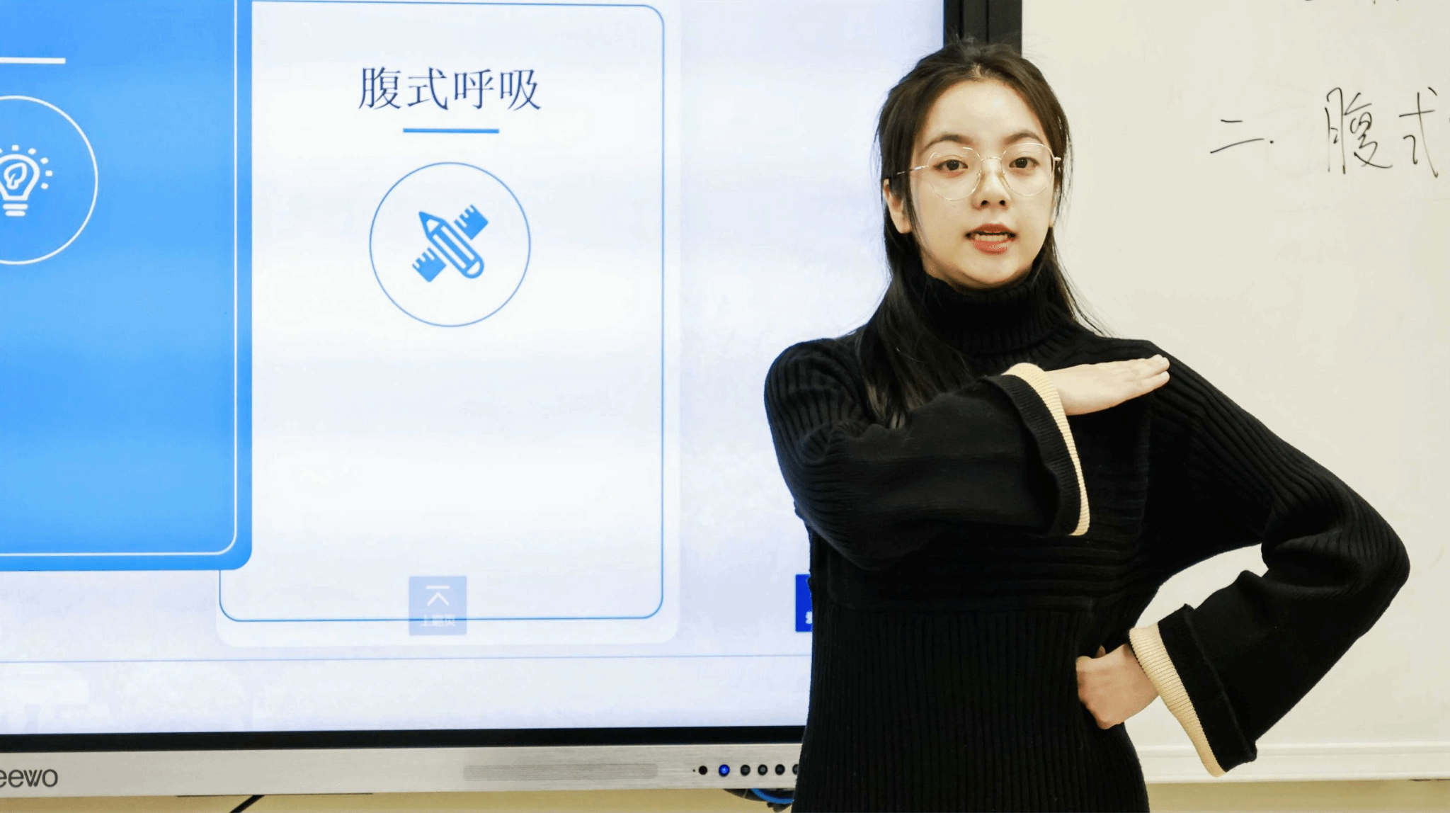 首先出场的是王雨柠老师,她本节课程的内容是歌唱中的呼吸原理。课程开始,她使用道具生动形象地讲解了呼吸时横膈膜的变化。接下来,她结合生活中的例子,示范了三种呼吸形式在歌唱中的运用,指出了三种呼吸的区别,并总结出胸腹联合呼吸是声乐中最合适的呼吸方式。