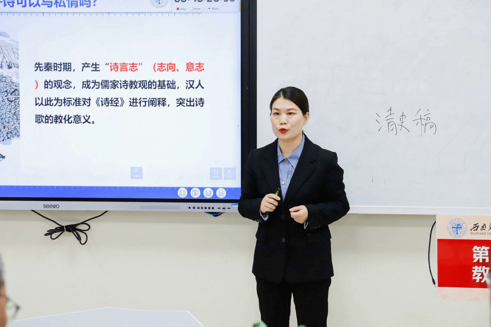 第十一届青年教师教学竞赛文科组决赛在犀浦校区X30304举行。王雨柠、马超、刘柳、周芳四位青年教师,分别讲授声乐(辅修)、传播心理学、钢琴艺术体验与审美、中国文学批评史四门本科课程。