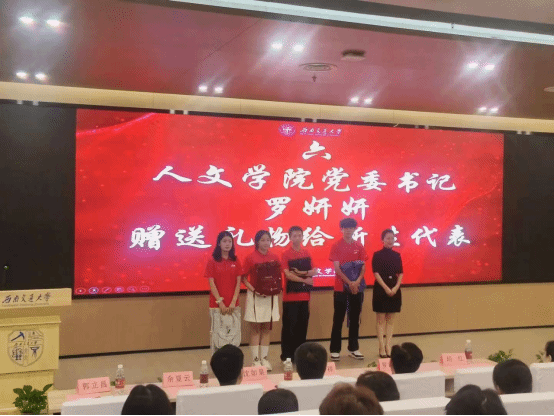 (学院党委书记罗妍妍为新生代表赠送礼品)