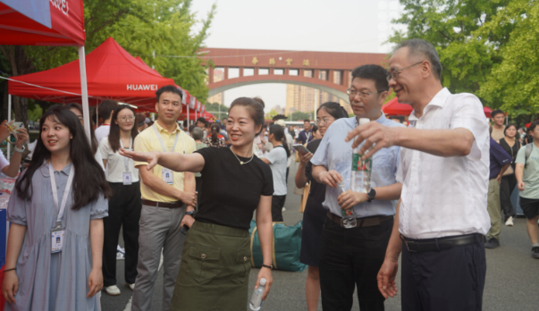 党委书记罗妍妍、党委副书记郭立昌、本科新生辅导员朱思颖以及其他学工老师的陪同下参观迎新布置现场和察看迎新工作进展,并与参与迎新工作的志愿者们进行了友好交流,对辛勤付出的老师和同学表示慰问。