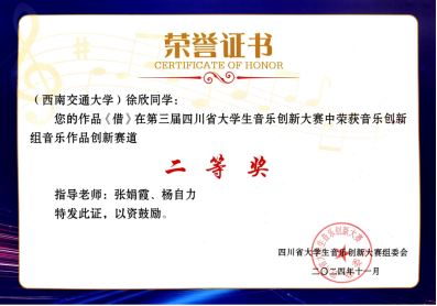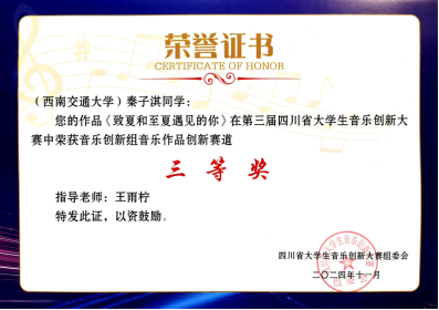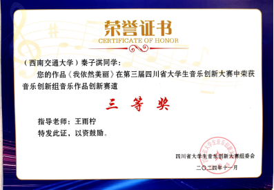 音乐系同学在第三届四川省大学生音乐创新大赛中获奖,彰显了我校美育成果的人文气息,也为我院美育工作的成果再添一笔。