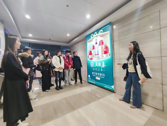 会后,集团总经理助理郭靖与人力资源总监庞欢带领师生开展现场教学,实地考察写字楼宇媒体、春熙路商圈及人民南路户外LED屏的广告应用场景。两位负责人深入解析户外广告的行业价值,为学生提供了丰富的行业认知,有效助力未来职业发展。