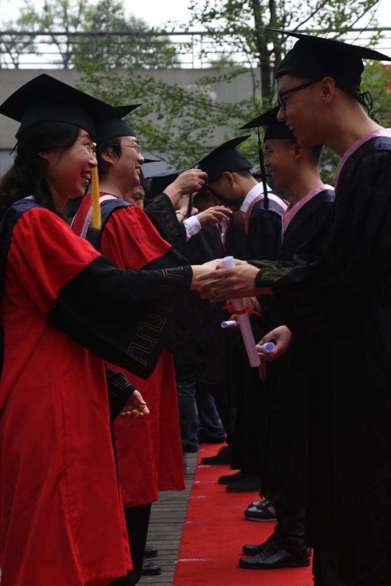 在激昂的乐曲声中,学院学术委员会成员为484名毕业生依次授位,毕业生们流苏扶正,喜获学位。授位仪式结束后,在《老师、我想你》的歌声中,毕业生代表向学术委员会老师赠送鲜花表达敬意。
