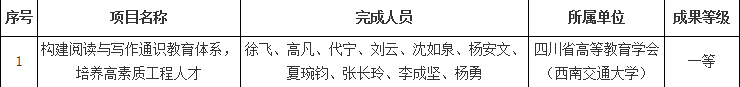 近日,四川省人民政府下发《四川省人民政府关于公布四川省第八届高等教育教学成果奖和四川省第六届普通教育教学成果奖的通知》(川府函〔2018〕64号),正式公布了第八届高等教育优秀教学成果名单,我院沈如泉副院长参与的《构建阅读与写作通识教育体系,培养高素质工程人才》项目荣获一等奖。