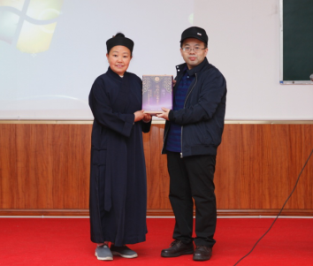 讲述结束后,两位主讲人分别就师生所提的道教醮仪与造像活动的关系、北朝至唐代楼观道的科仪活动等问题予以耐心解答。唐华道长通过精彩的实例介绍,进一步强调了科仪法事在道教活动的重要性。最后,吕鹏志教授代表中国宗教研究中心向青城山道教学院赠送了其与劳格文教授合作主编的《道教仪式丛书》之第③种《闽西南永福闾山教传度仪式研究》(新文丰出版公司2017年出版)和本次讲座的海报。