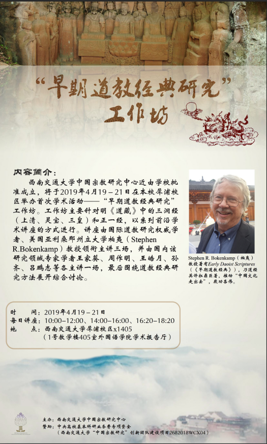 中国宗教研究中心近由学校批准成立,并将于2019年4月19-21日在本校犀浦校区举办首次学术活动——“早期道教经典研究” 工作坊。工作坊主要针对明《道藏》中的三洞经(上清、灵宝、三皇)和正一经,以系列前沿学术讲座的方式进行。讲座由国际道教研究权威学者、美国亚利桑那州立大学柏夷(Stephen R. Bokenkamp)教授领衔主讲三场,并由国内该研究领域专家学者王家葵、周作明、王皓月、孙齐、吕鹏志等各主讲一场,最后是集体综合讨论和发言。