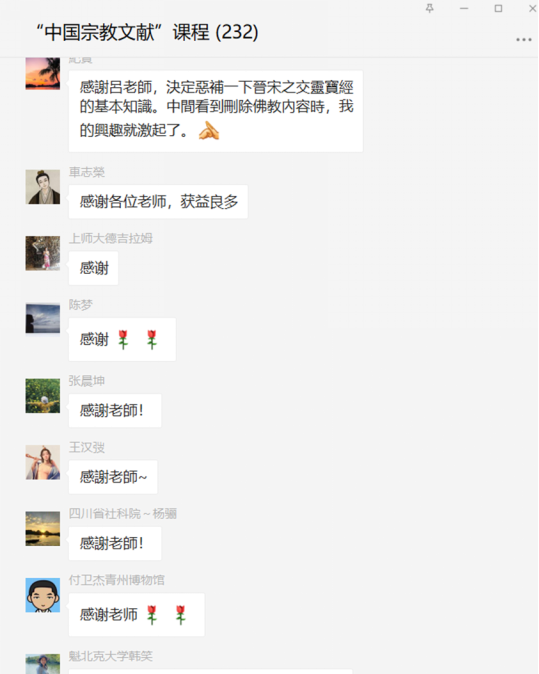 。除全体主讲嘉宾之外,课程组还特邀下列嘉宾担任微信群讨论指导教师:曹凌(上海师范大学哲学与法政学院讲师)、张超然(辅仁大学宗教系副教授)、雷闻(中国社会科学院古代史研究所研究员)、杨志飞(西安外国语大学副研究员)、李福( Gil Raz, 达特茅斯学院教授)、宗树人(David A. Palmer, 香港大学教授)、张粲(木瓜视频