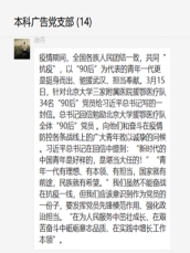 本科广告党支部在微信群中开展有关“学习贯彻习近平总书记重要回信精神”主题党日活动。活动主要内容为学习习近平总书记对在首钢医院实习的西藏学生以及战疫过程中北京大学援鄂医疗队全体“90后”党员的回信。