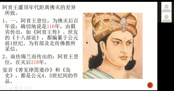 2. 佛灭的具体时间:纪老师对佛灭具体时间进行考证,梳理了汉传传统、斯里兰卡、西方学者和日本学者宇井伯寿对于佛灭具体时间的考证,经过阿育王登基时间作为参照的测算,得出实际佛灭时间要比我们中国认定的公元前486年要晚一百多年,为公元前390-387年。