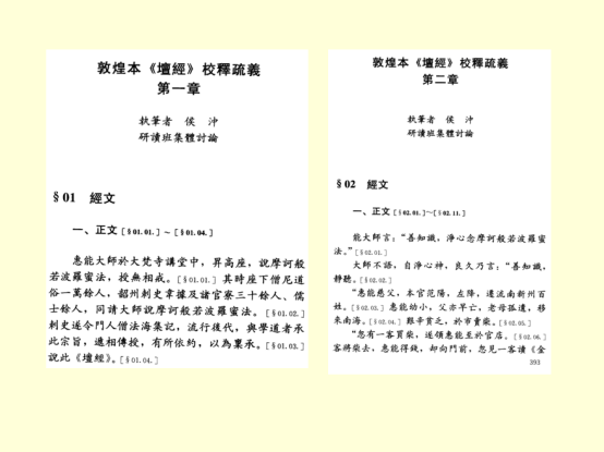2006年侯老师在方广锠教授的提议下参加敦煌本《坛经》的读书班,并完成敦煌本《坛经》校释疏义第一章、第二章,该部分收录于《藏外佛教文献》第十辑。2007年侯教授进一步有了三点思考。其一,他不同意周绍良先生把敦煌本《坛经》当作“原本”的说法,指出其中付法衣的有关文字明显是神会滑台大会以后出现的文字。其二,补充了杨曾文教授关于《坛经》诸本之间的演变情况及异同的讨论。经过查阅比勘《坛经》诸本,他认为兴圣寺本、金山天宁寺本、大乘寺本、高丽传本与敦煌本一样都属于神会系《坛经》,而契嵩本自成另外一个系列。其三,敦煌本《坛经》中“五祖弘忍”一词的出现,其实已经是在惠能圆寂之后、七祖出现之时才出现的,《坛经》中出现的禅宗祖统也出现在这个时期。