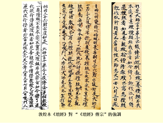 本次讲授的第四部分是“从传衣到《坛经》传宗”。如上所述,敦煌本是神会系的《坛经》,即今《坛经》“祖本”。而《坛经》的出现与神会强调慧能的传法是“传衣”有密切的关系。《菩提达摩南宗定是非论》是神会强调传衣的著作,通过慧能得到了达摩以降历代祖师相传的袈裟,从而确立这一法脉的正统性。《景德传灯录》中保存的神会的《显宗记》也对衣法二者的密切关系进行了强调。但是后来袈裟辗转流入无住系手中。神会系没有了袈裟,便没有了强调自己是正宗的依据。于是只能声称由于以往传袈裟惹是非,故而改传《坛经》。敦煌本《坛经》中已经有了《坛经》传宗的说法。这就是《坛经》创作的背景,即作为“传宗”的依凭而非着重于内容精确无误,所以《坛经》的正文中读不通的地方就很好理解了。