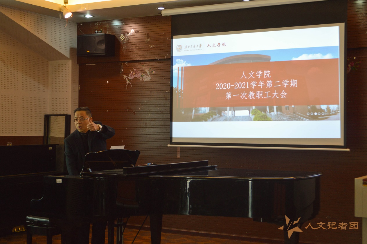 领导班子及全体教职工参加了会议。会议伊始,音乐系刘飞云主任为老师们讲解《如何正确发音,保护嗓子》,音乐系涂覃平副教授带领全体教职工一起学唱了春晚歌曲《可可托海的牧羊人》,悠扬动听的歌声放松了老师们的心情,别出心裁的开场使得会场散发着浓郁的人文艺术气息。