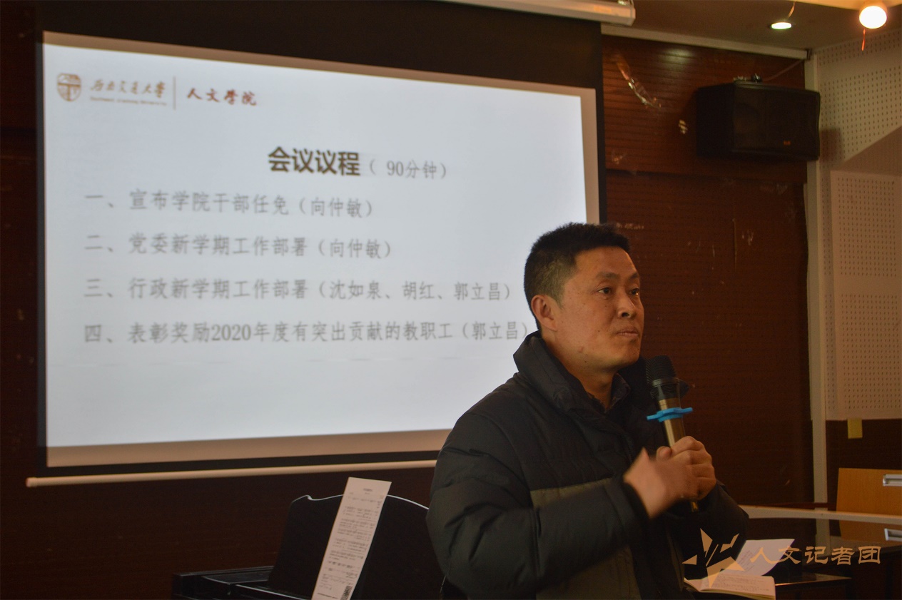 胡红副院长对近期本科教学工作做了相关部署。郭立昌副书记介绍了其分管的纪委工作、学生工作尤其是就业工作,动员老师们关注学生培养及就业。