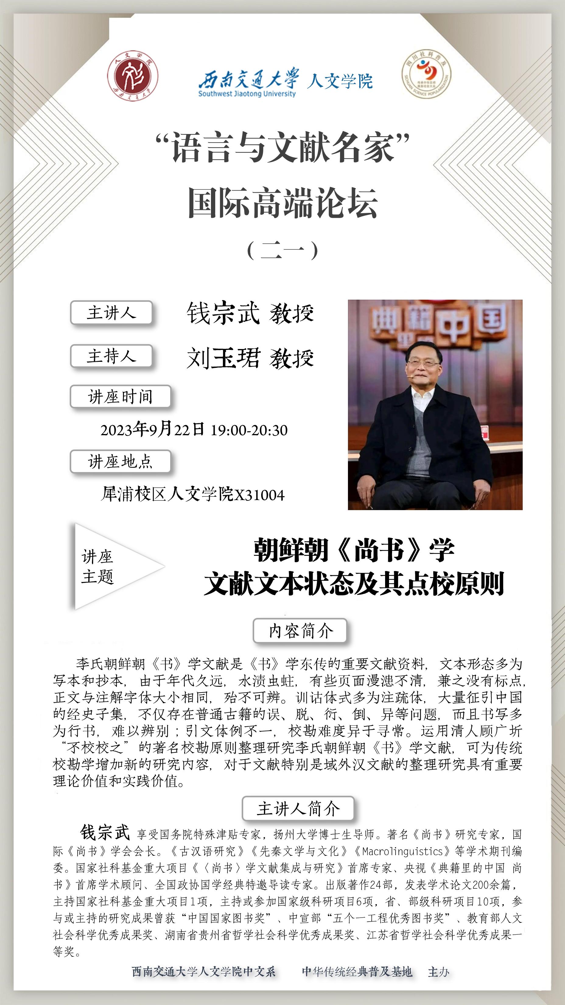 钱宗武,享受国务院特殊津贴专家,扬州大学博士生导师。著名《尚书》研究专家,国际《尚书》学会会长。《古汉语研究》《先秦文学与文化》《Macrolinguistics》等学术期刊编委。国家社科基金重大项目《<尚书>学文献集成与研究》首席专家、国家社科基金重大委托项目及国家重点图书出版规划项目《中华传统文化百部经典 尚书》解读专家、央视《典籍里的中国 尚书》首席学术顾问、全国政协国学经典特邀导读专家。出版著作24部,发表学术论文200余篇,主持国家社科基金重大项目1项,主持或参加国家级科研项目6项,省、部级科研项目10项,参与或主持的研究成果曾获“中国国家图书奖”、中宣部“五个一工程优秀图书奖”、教育部人文社会科学优秀成果奖、湖南省贵州省哲学社会科学优秀成果奖、江苏省哲学社会科学优秀成果一等奖。