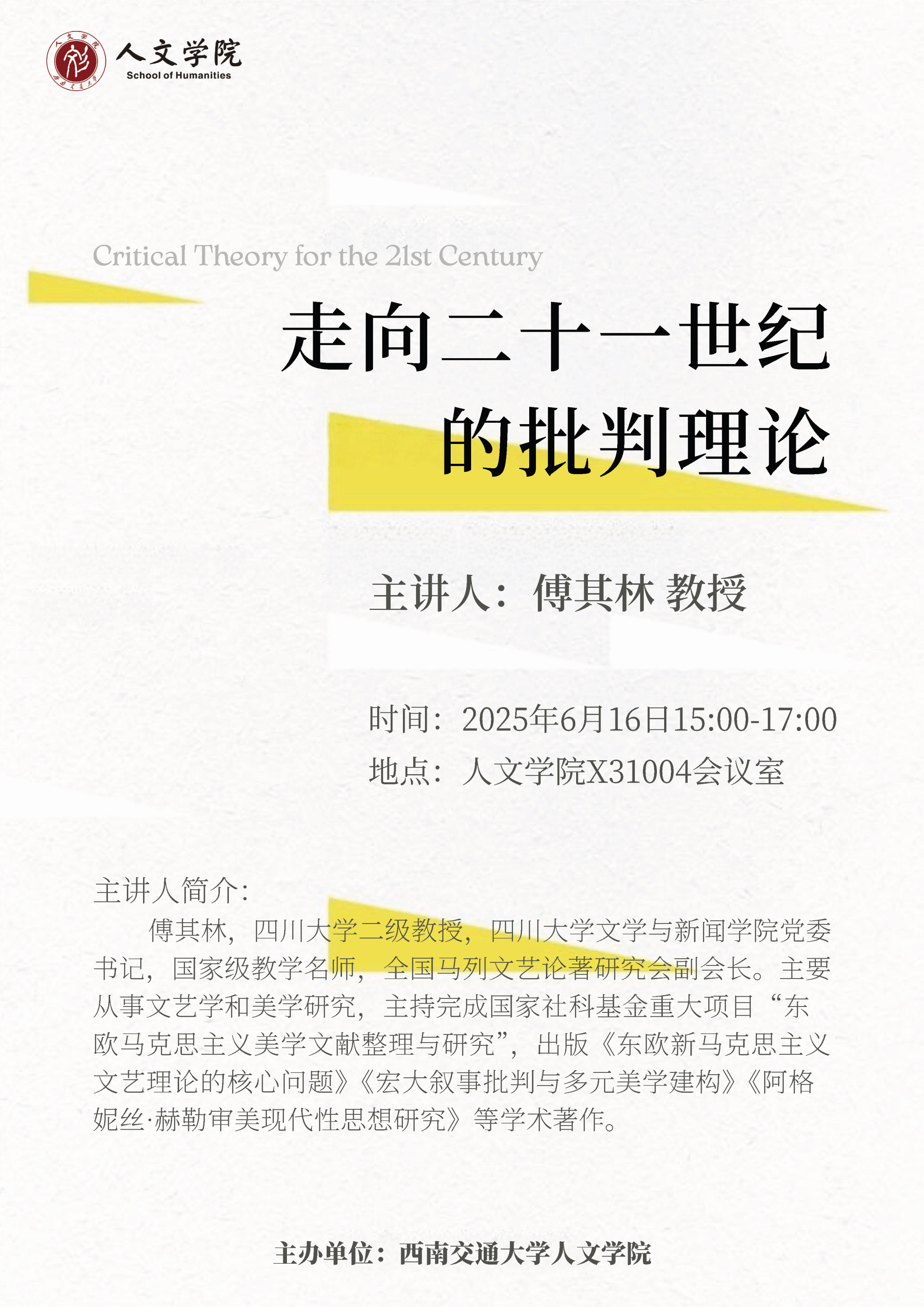 主讲人介绍:傅其林,文学博士,四川大学二级教授,四川大学文学与新闻学院党委书记,国家级教学名师,全国马列文艺论著研究会副会长。主要从事文艺学和美学研究,主持完成国家社科基金重大项目“东欧马克思主义美学文献整理与研究”,出版《东欧新马克思主义文艺理论的核心问题》《宏大叙事批判与多元美学建构》《阿格妮丝·赫勒审美现代性思想研究》等学术著作。