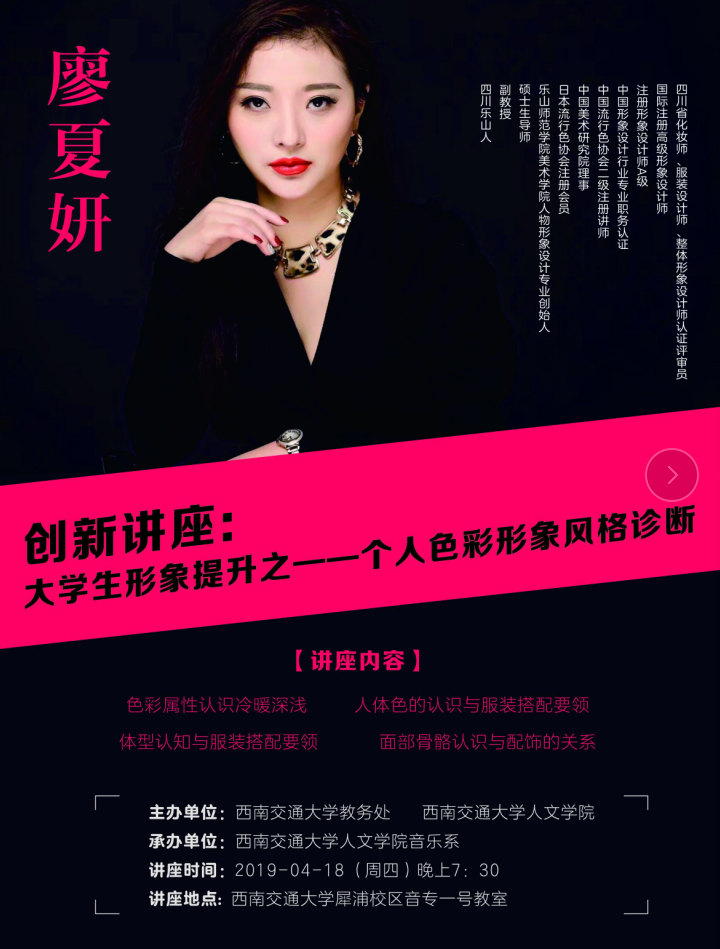 嘉宾简介:四川乐山人;副教授; 硕士生导师;乐山师范学院美术学院人物形象设计专业创始人;中国美术研究院理事;日本流行色协会注册会员;中国流行色协会二级注册讲师;中国形象设计行业专业职务认证;注册形象设计师A级;国际注册高级形象设计师;四川省化妆师、服装设计师、整体形象设计师认证评审员