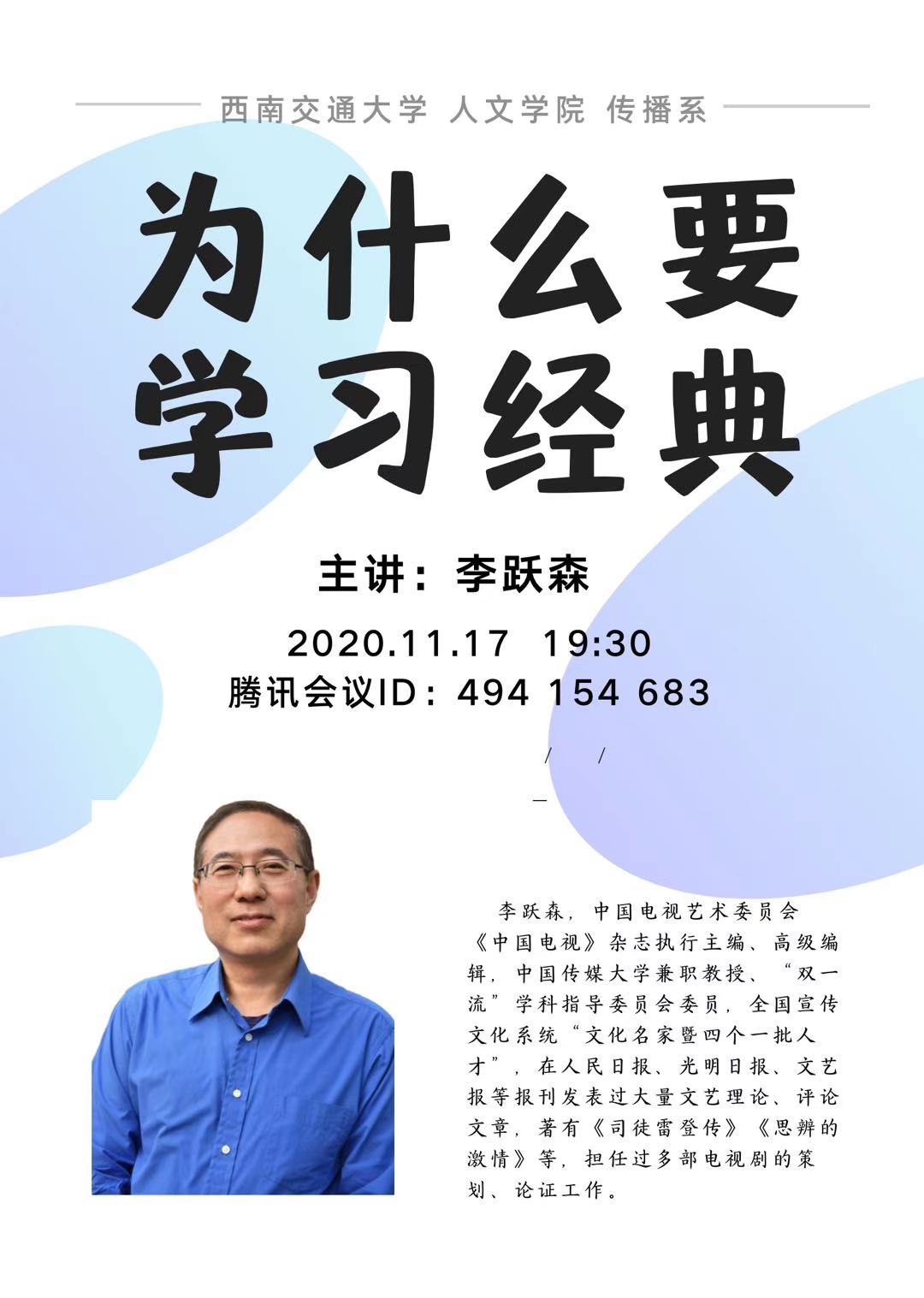 主讲人及简介:李跃森,中国电视艺术委员会《中国电视》杂志执行主编、高级编辑,中国传媒大学兼职教授、“双一流”学科指导委员会委员,全国宣传文化系统“文化名家暨四个一批人才”,在人民日报、光明日报、文艺报等报刊发表过大量文艺理论、评论文章,著有《司徒雷登传》《思辨的激情》等,担任过多部电视剧的策划、论证工作,担任编剧的电视剧《龙票》产生了较大的社会反响,多年来担任中宣部“五个一工程”评委、文化产业基金评委、当代翻译工程评委,重点现实题材电视剧剧本创作计划专家组成员,国家广电总局“飞天奖”“星光奖”评委、“金鹰奖”评委、优秀剧本扶持项目评选专家、“网络视听节目精品创作传播工程”评选专家、“走出去工程”评选专家,中宣部文艺局电视剧审看专家、广电总局网络司评审专家,中央电视台节目评估、监看专家,北京市广电局网络视听发展基金评选、网络节目审看专家。