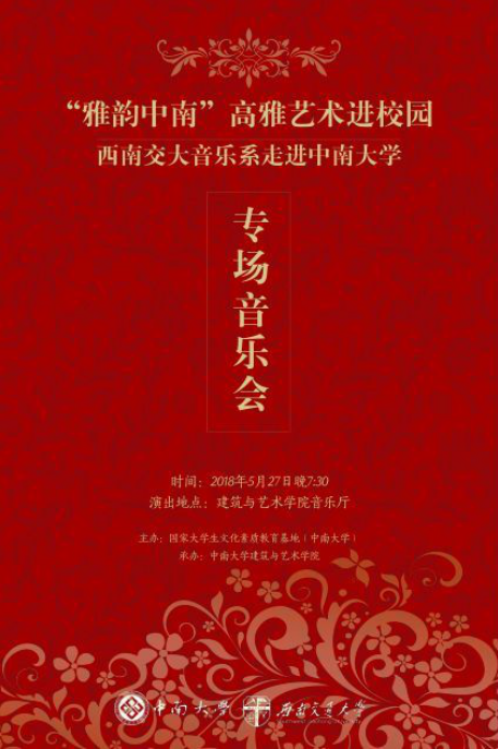 高雅艺术进校园——西南交大音乐系走进中南大学专场音乐会 5月27日晚7点半,高雅艺术进校园/雅韵中南--西南交大音乐系走进中南大学专场音乐会在长沙·中南大学建筑与艺术学院音乐厅隆重登场。我校木瓜视频 音乐系杨树莉教授和九里之声四重唱组合:郭清波、孙轶、王强、马健老师为中南大学的师生们带来了《我住长江头》、《主人,请听我说》、《桑塔露琪亚》、《海港之夜》、《森林水车》、《成都》、《回娘家》、《游击队歌》等中外经典曲目。演出受到了中南大学师生热烈欢迎,现场掌...