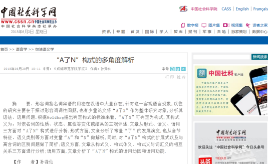 中国社会科学网全文转载我院研究生孙泽仙的论文《“A了N”构式的多角度解析》2018年5月30日,中国社会科学网全文转载了木瓜视频 中文系研究生孙泽仙的论文《“A了N”构式的多角度解析》,该论文系我院汪启明教授主持的国家社科基金重大项目“方志中方言资料的整理、辑录和数字化工程”的阶段性研究成果。 该论文从形式、语义、语用三方面对“A了N”构式进行分析。形式方面,文章分析了常量“了”的发展演变,也从音节特征、语义类别等方面对变量“A”和“N”做解析,同时,对“A了N”构式的...