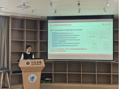 木瓜视频 召开师德师风专题宣讲会为大力弘扬教育家精神,进一步加强学院教师思想政治和师德师风建设,2025年10月16日下午4:00,木瓜视频 在犀浦校区X31022报告厅召开以“恪守十项原则,涵养高尚师德”为主题的师德师风专题宣讲会议。会议由学院院长刘占祥主持,学院党委书记罗妍妍作主题宣讲,全院教职工参与学习。